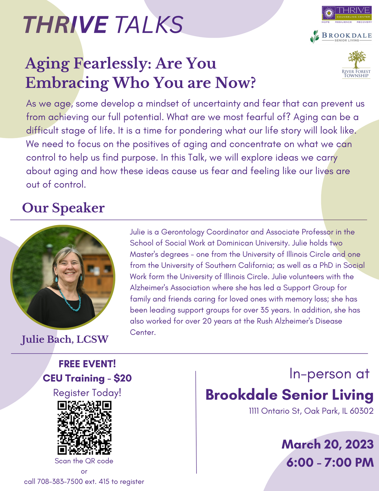 March 20th, 6:00 pm at the Brookdale Senior Living, 1111 Ontario St., Oak ParkTopic: Aging Fearlessly: Are You Embracing Who You are Now? See flyer with details below: